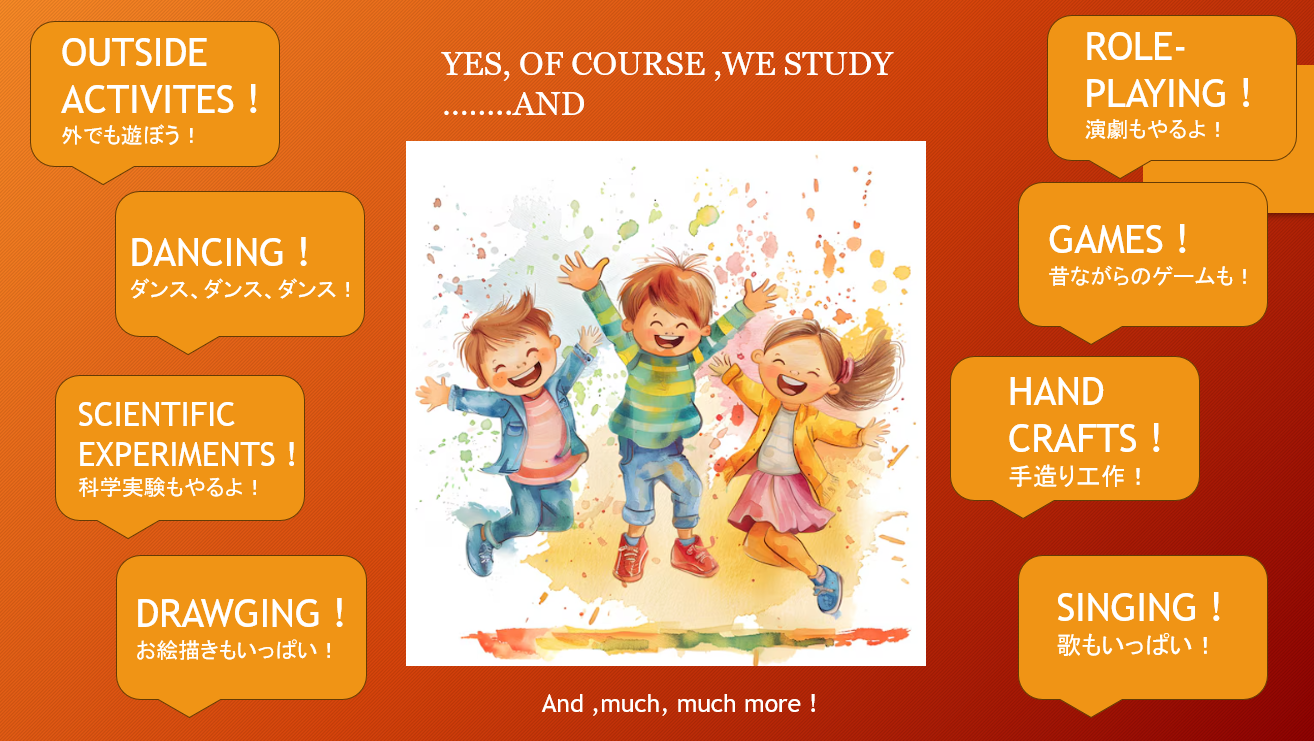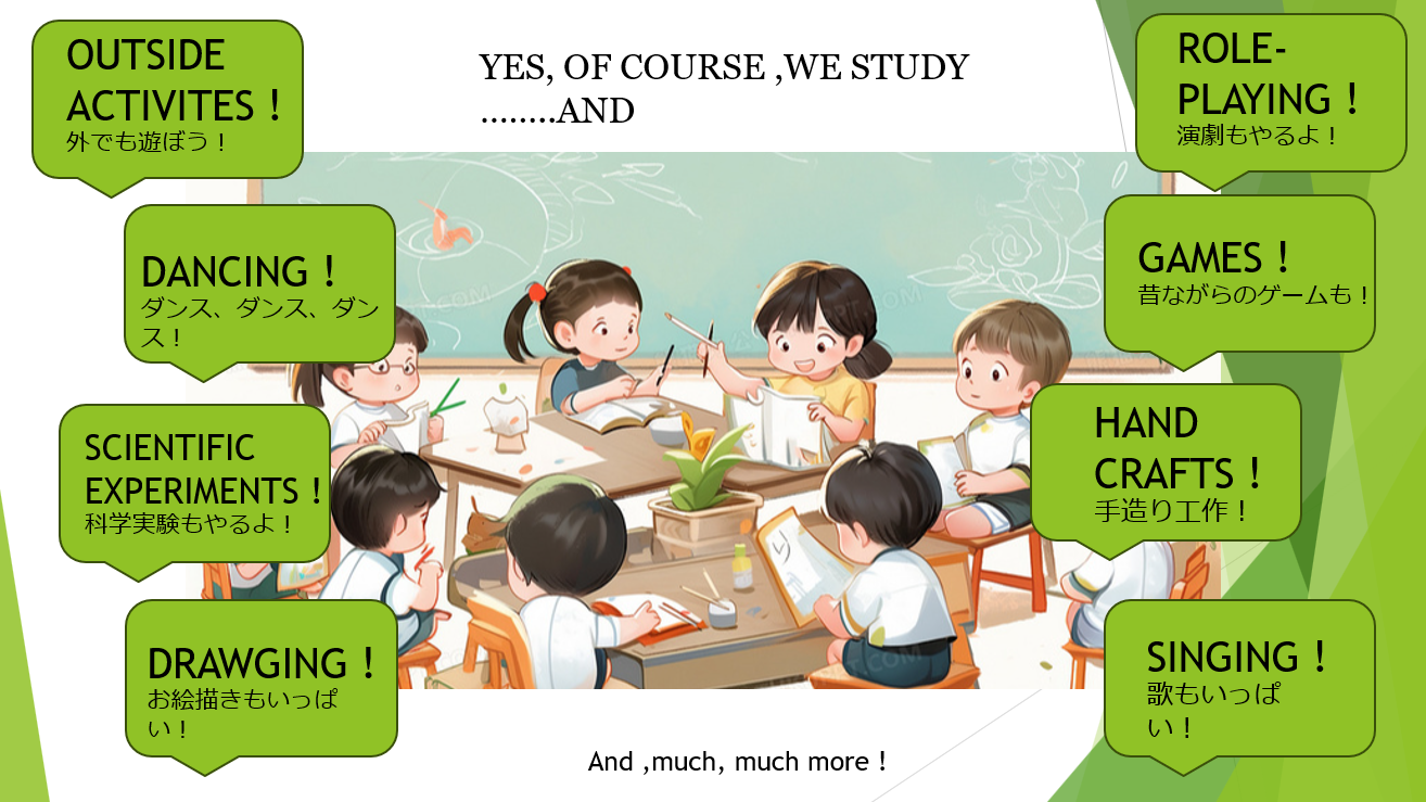 We have Chinese songs, arts, drawing, hand-craft, role play, poems, picture books,playing music with instruments, cooking, martial arts .......much much more!