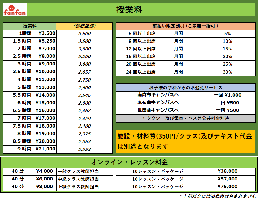 交通費:実費(申込時に決定)、最低料金:片道500円 x 2 (往復)=1,000円+TAX=1,100円